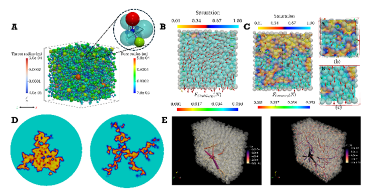 (A) Illustration of PUA-DEM partitioning fluid-solid domains for modeling a triphasic system. Distribution of air-water interfaces and capillary forces juxtaposed on DEM particle. (B) Capillary regime. (C) Funicular regime. (D) Fluid-fluid interface instability, capillary fingering (left) and viscous fingering (right). (E) Force chain evolution in granular medium embedded with swellable material, low confinement (left) and high confinement (right).